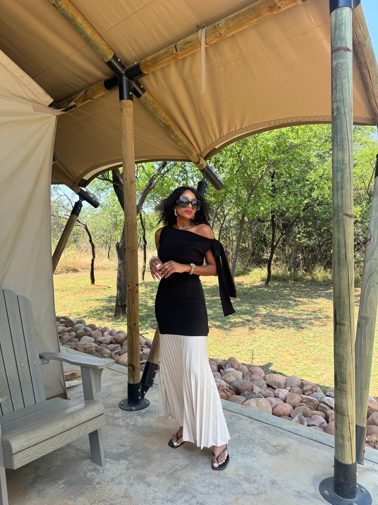 Crafted in nude and black hues, this dress features an elevated neckline , relaxed sleeveless fit, and a cinched waist that flatters without effort.
