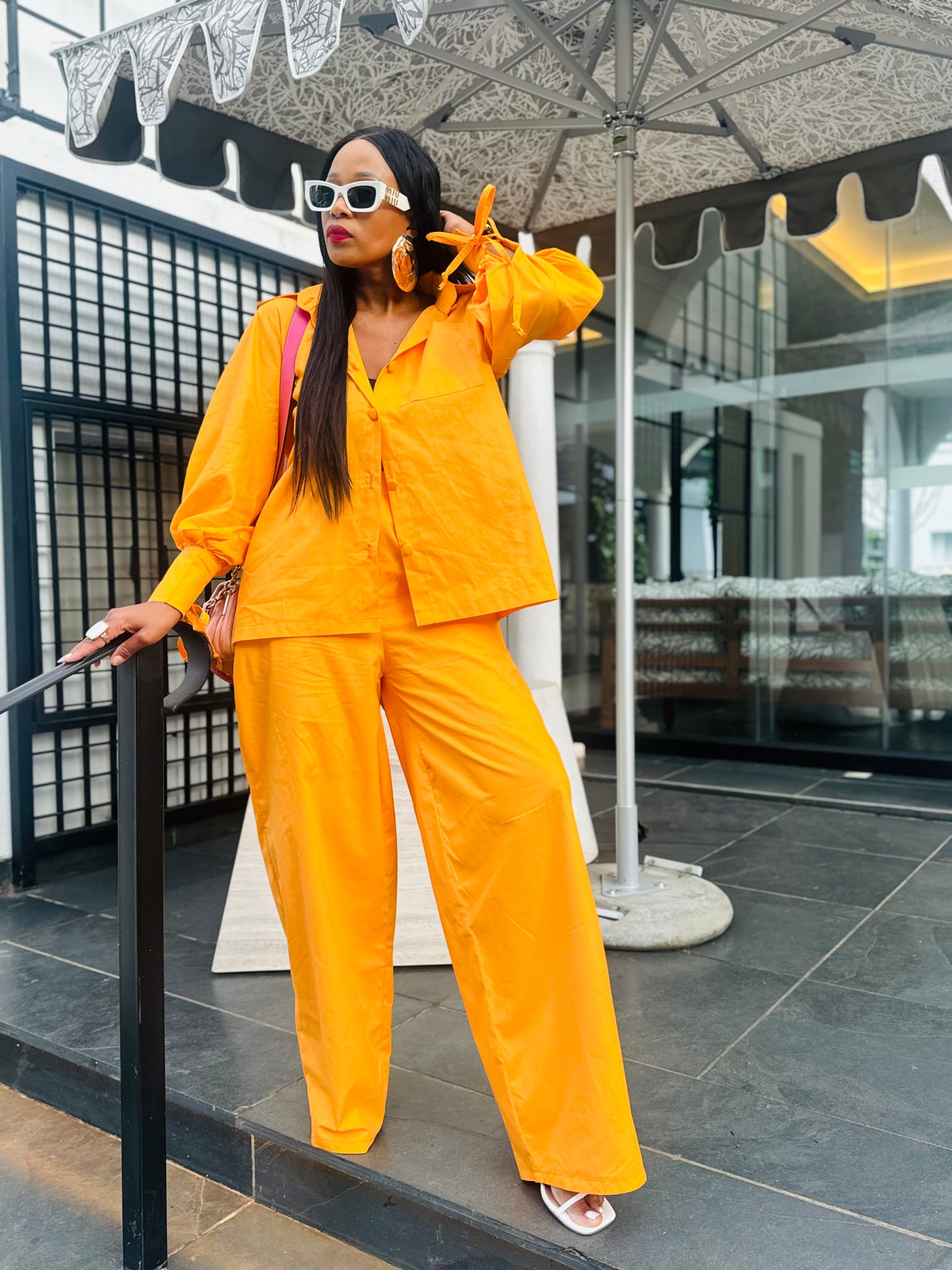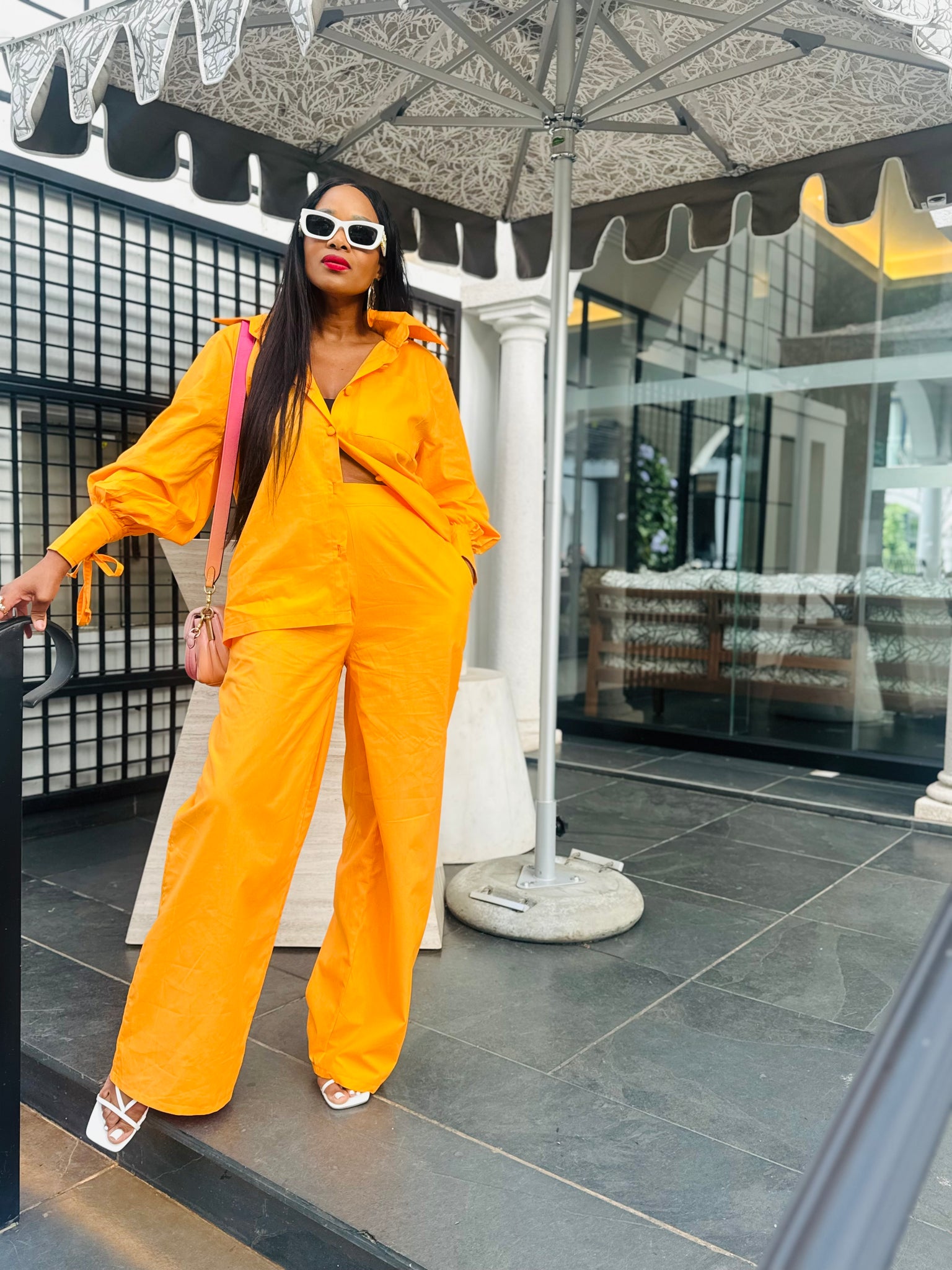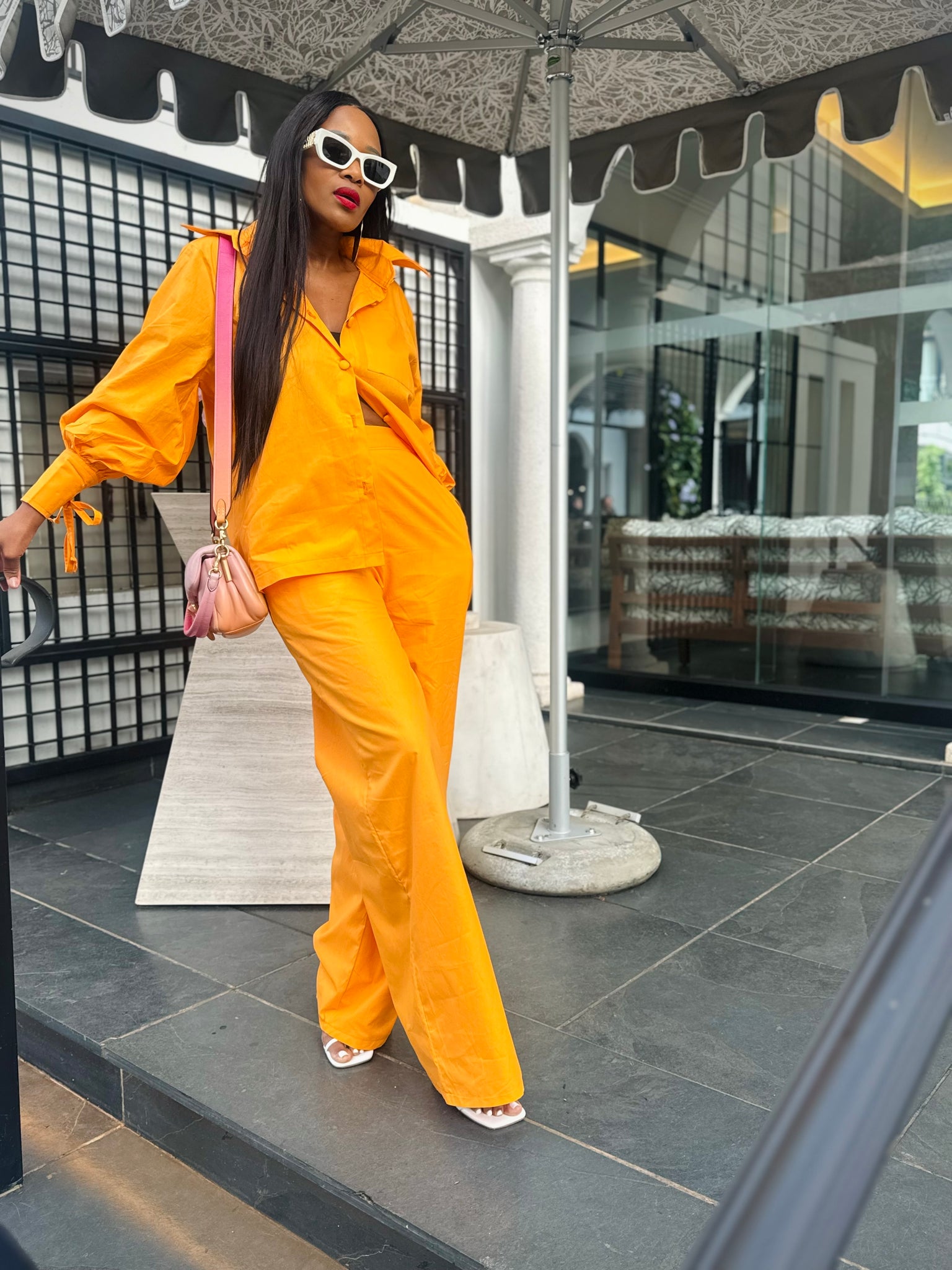 Beautiful cotton pants and button-down shirt for an effortlessly chic look.