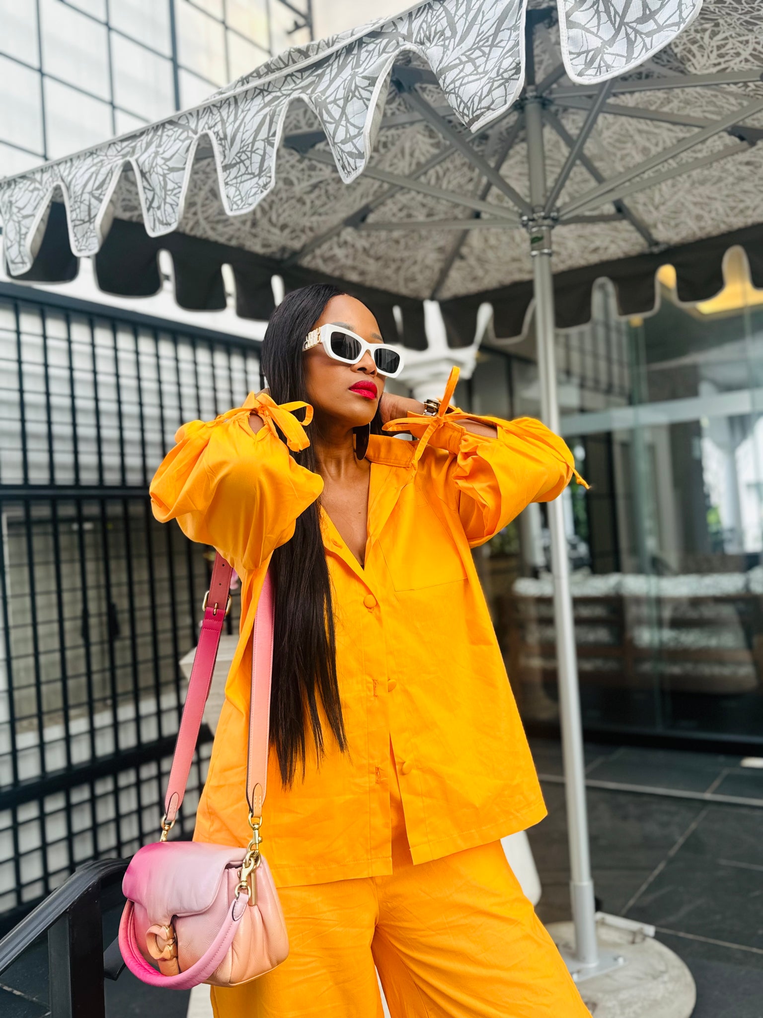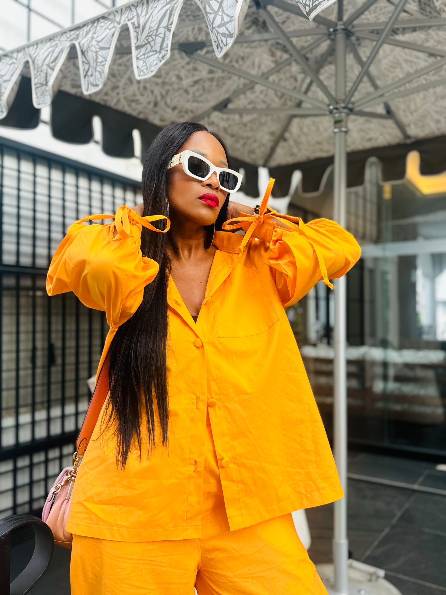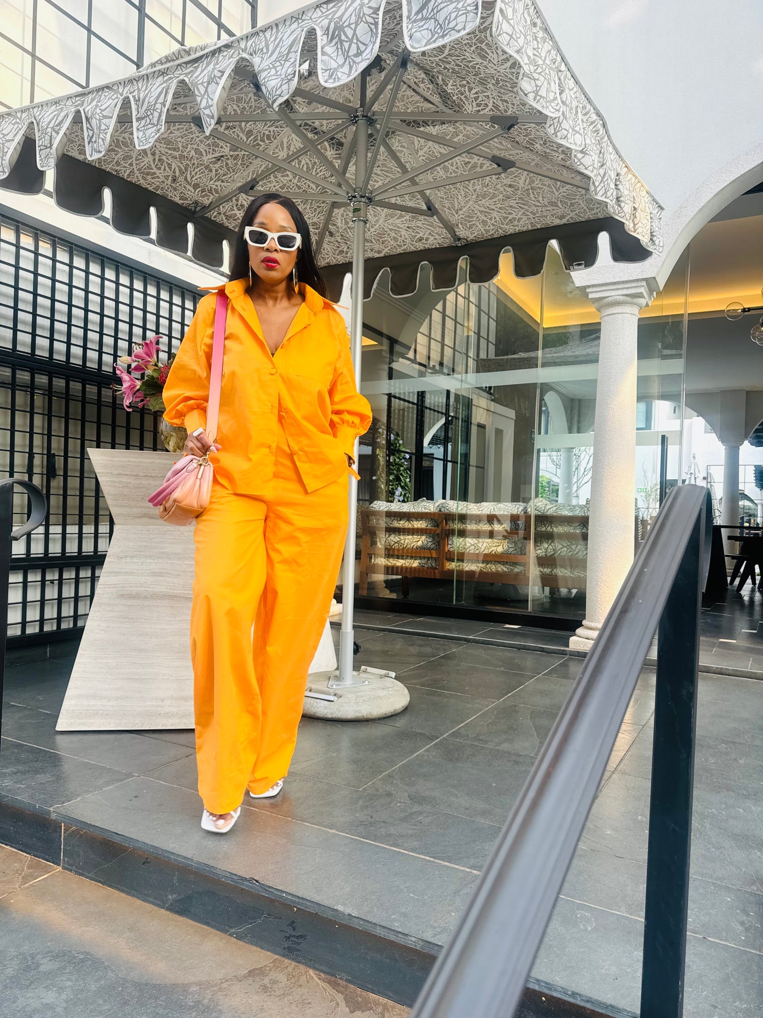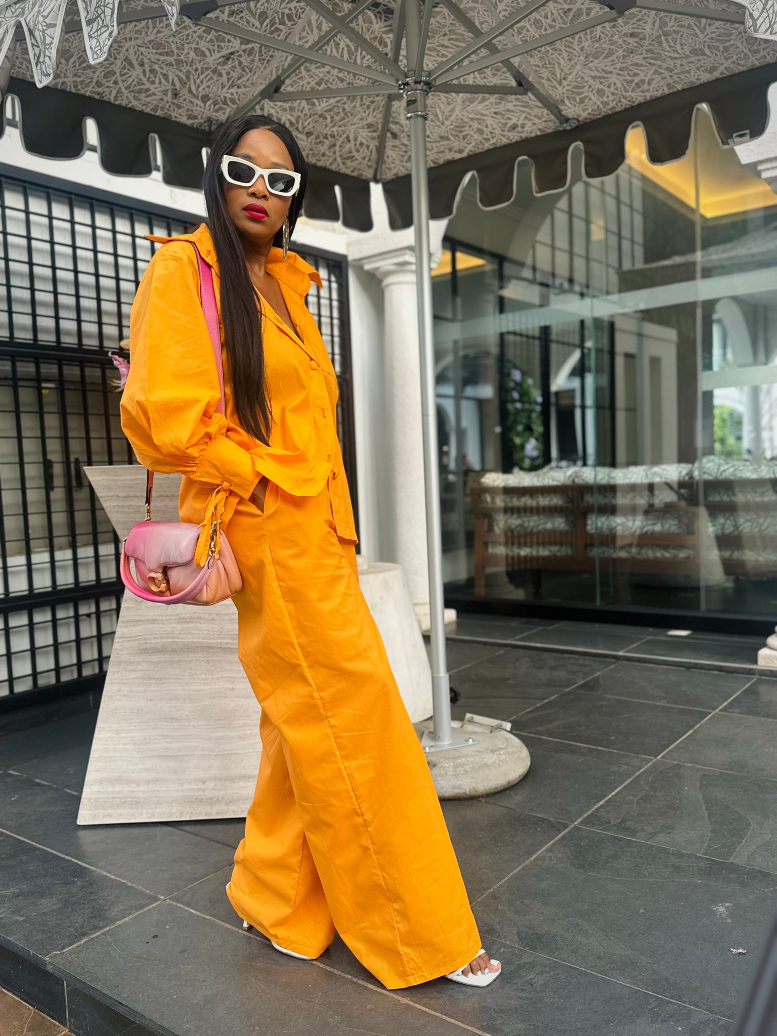 Beautiful cotton pants and button-down shirt for an effortlessly chic look.